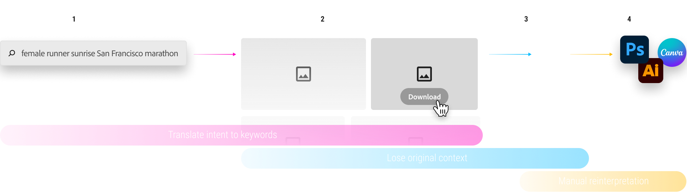 Asset discovery is still driven by keyword search, forcing creators to translate creative intent into filters and results.